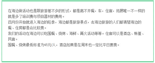 所以在不同的标准下,费用是不一样的,需要了解清楚这次活动所有标准与要求,我们才比较准确报价。需要去海边做拓展活动的小伙伴可以联系我们,让我们给您量身定做方案!