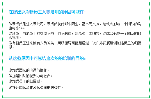 当一个企业领导提出给新员工做一次户外拓展培训时,是什么情况下提出来的呢?提出这一想法到底是为了什么呢?做这样的培训到底想达到什么效果呢?培训有效果了,想把这个效果延续多久呢?我们要一一了解了这些为什么呢,才能对症下药,才能给出正确的项目,这样的培训才能达到最好的效果!